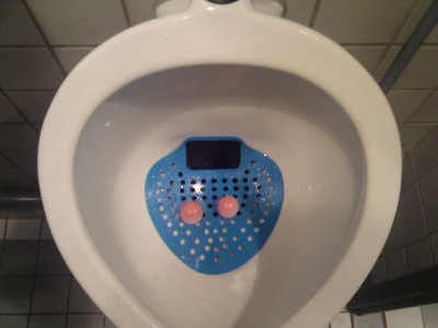 and a ‘normal’ toilet at the far end. A pretty normal setup for a restroom. I go for the urinary, quick and easy (one of the many upsides of being a man). However, on the bottom the urinary are two white round things, lying on a blue/green rounded-triangular shaped net. At First you think ‘hey look, someone lost somethings”